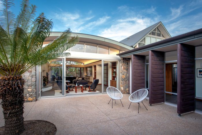 A large modern kitchen boasts plenty of bench space and ocean glimpses through the trees. The dining area opens onto the alfresco, shaded by the Peppermint trees and a Vergola louvered roof.