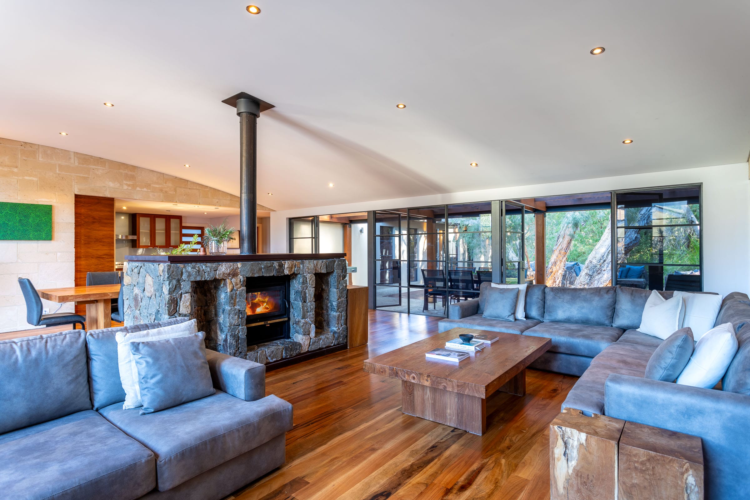 Mimicking its coastal surroundings, Blue Skies at Bunker Bay is dressed in local stone and rich, hardwood timbers. The heart of the home, a large open-plan living space that connects to the outside alfresco and deck via floor-to-ceiling glass windows and doors, features a beautiful, double-sided stone fireplace, a huge kitchen and a 10-seater dining table.