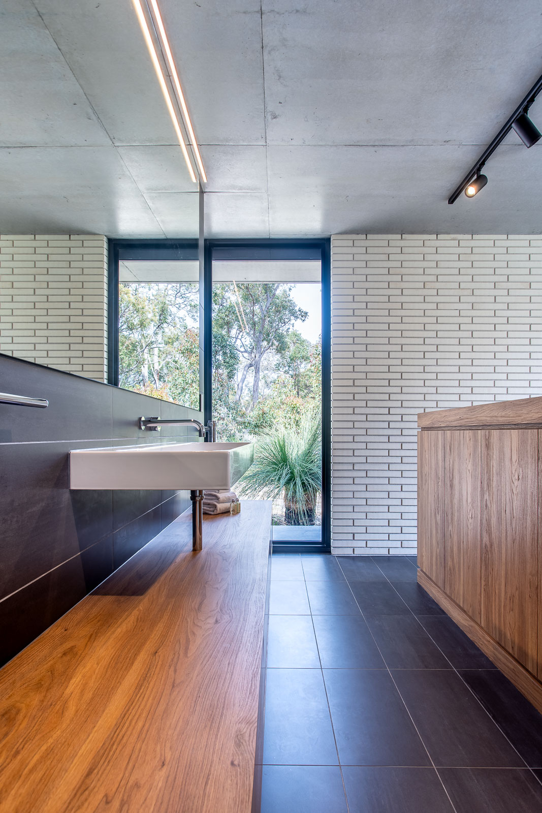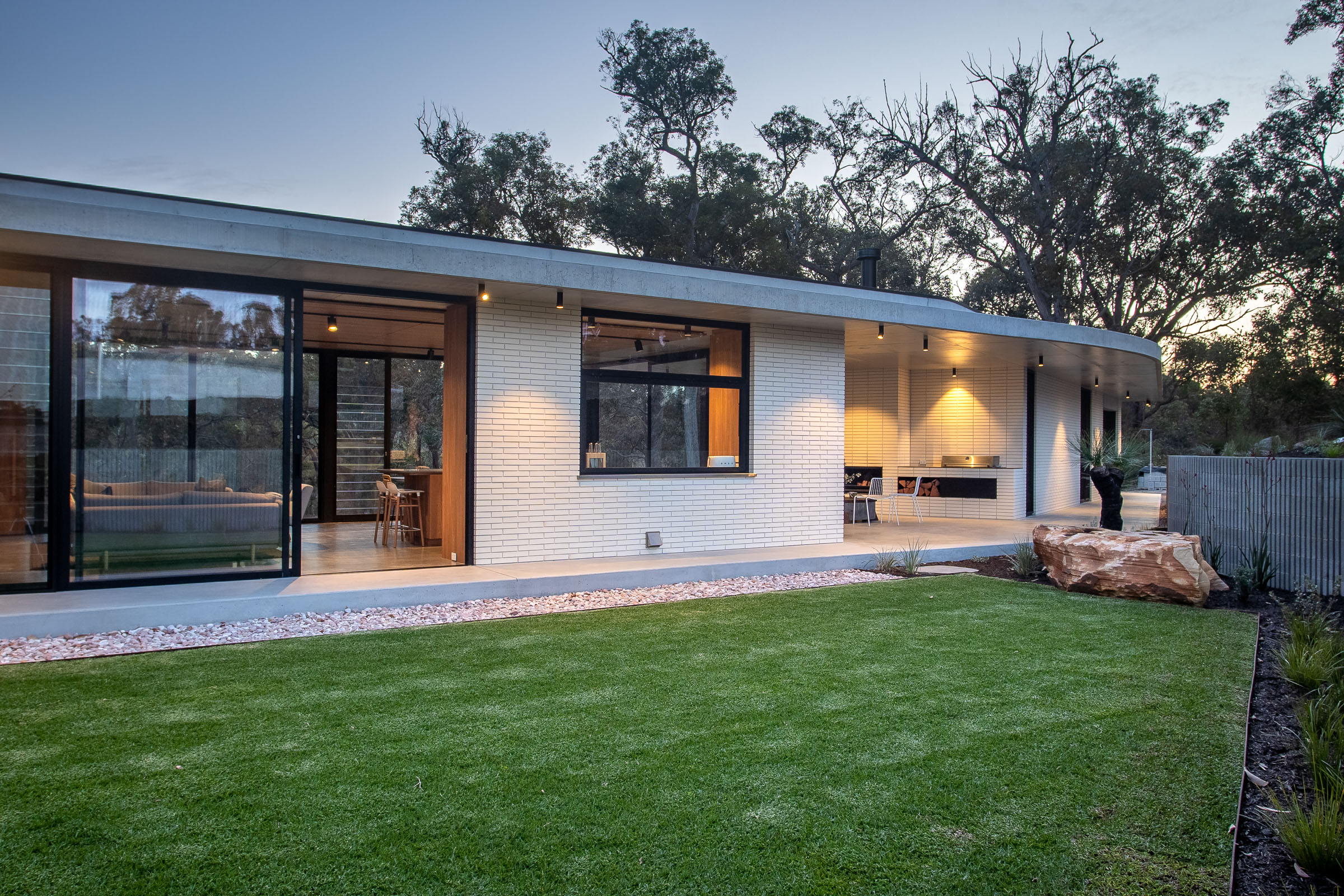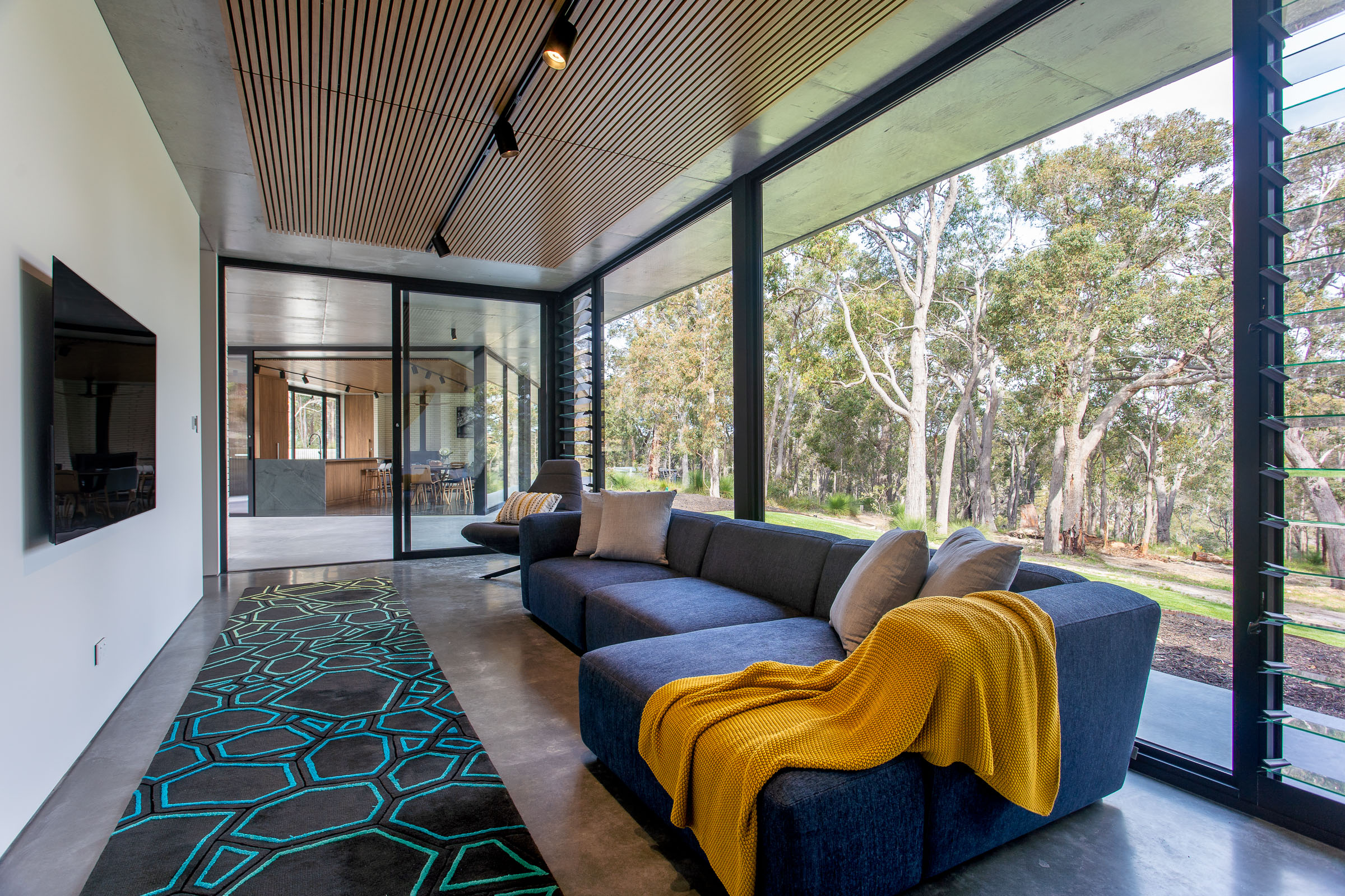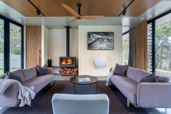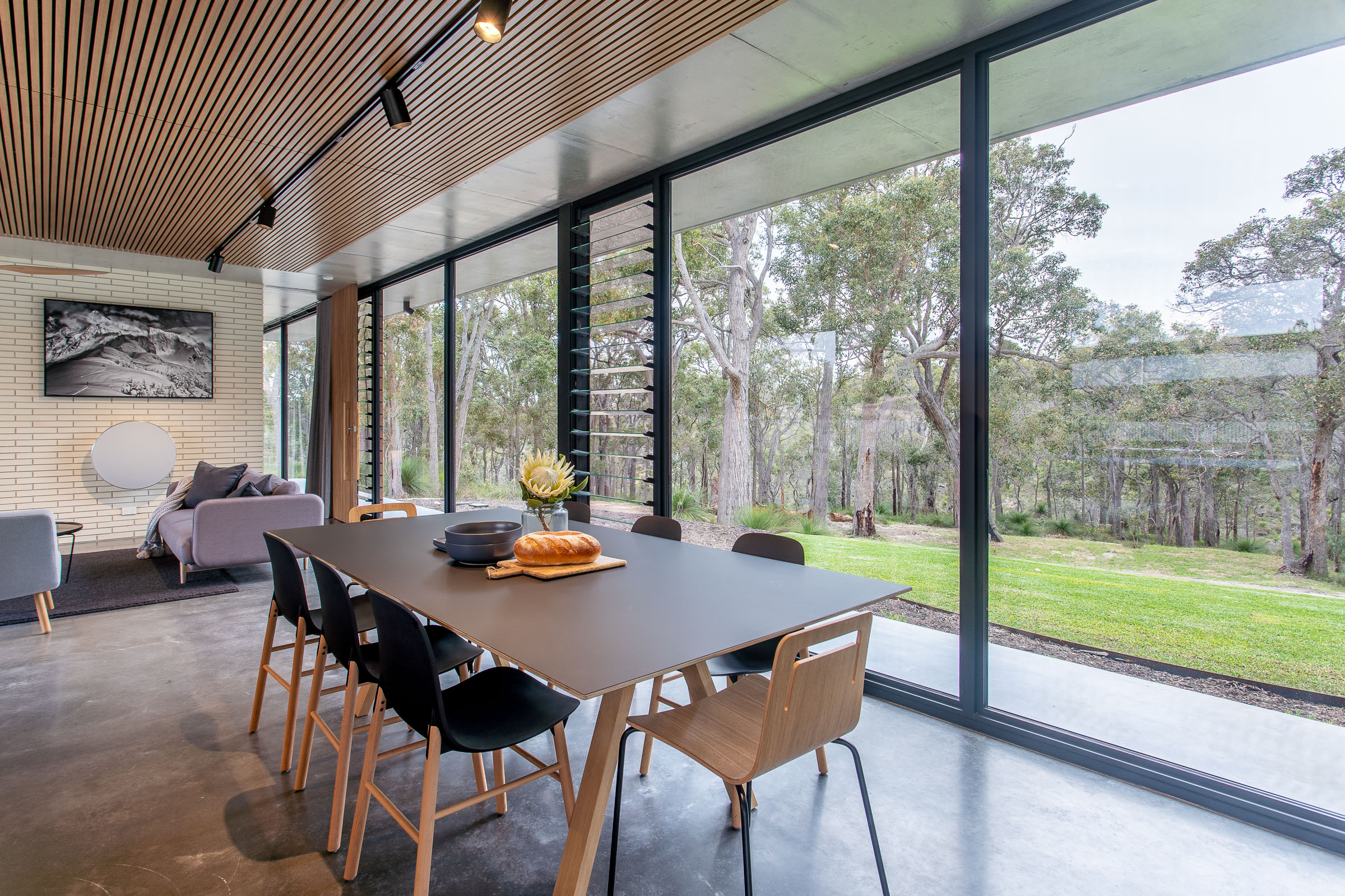 Solar passive design ensures this house is cool in the summer and warm in the winter. Expansive sliding doors allow the gentle valley breeze to flow through in the summer, and in the winter, the glass soaks in the sunshine plus there's underfloor heating throughout and a wood fire to keep you warm.