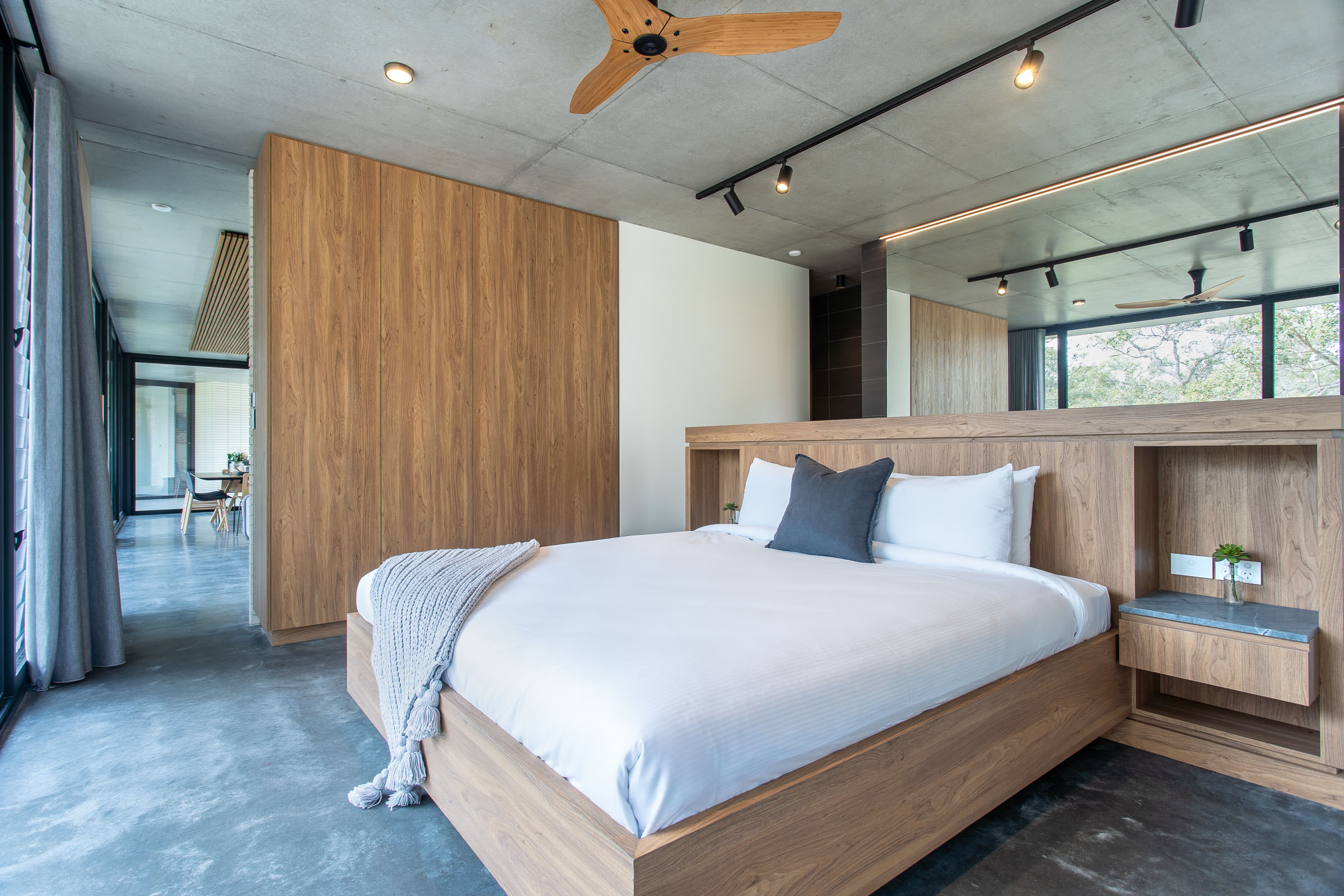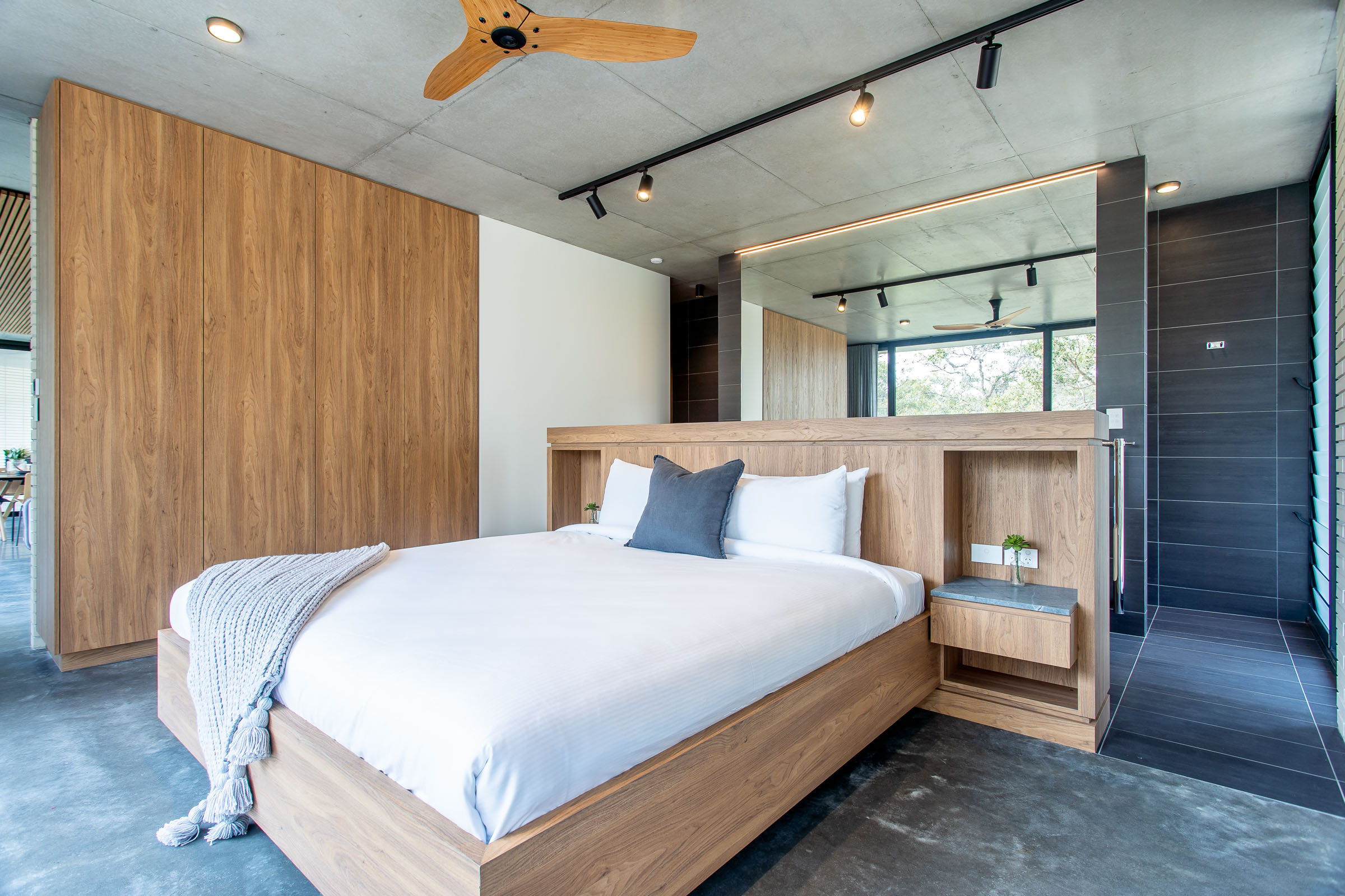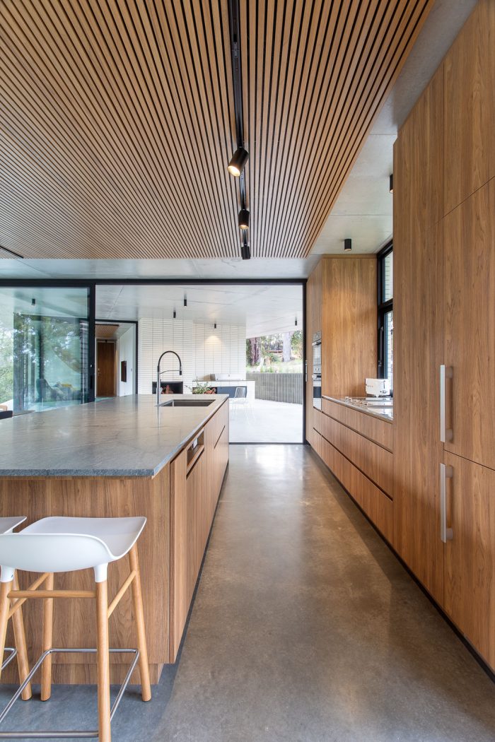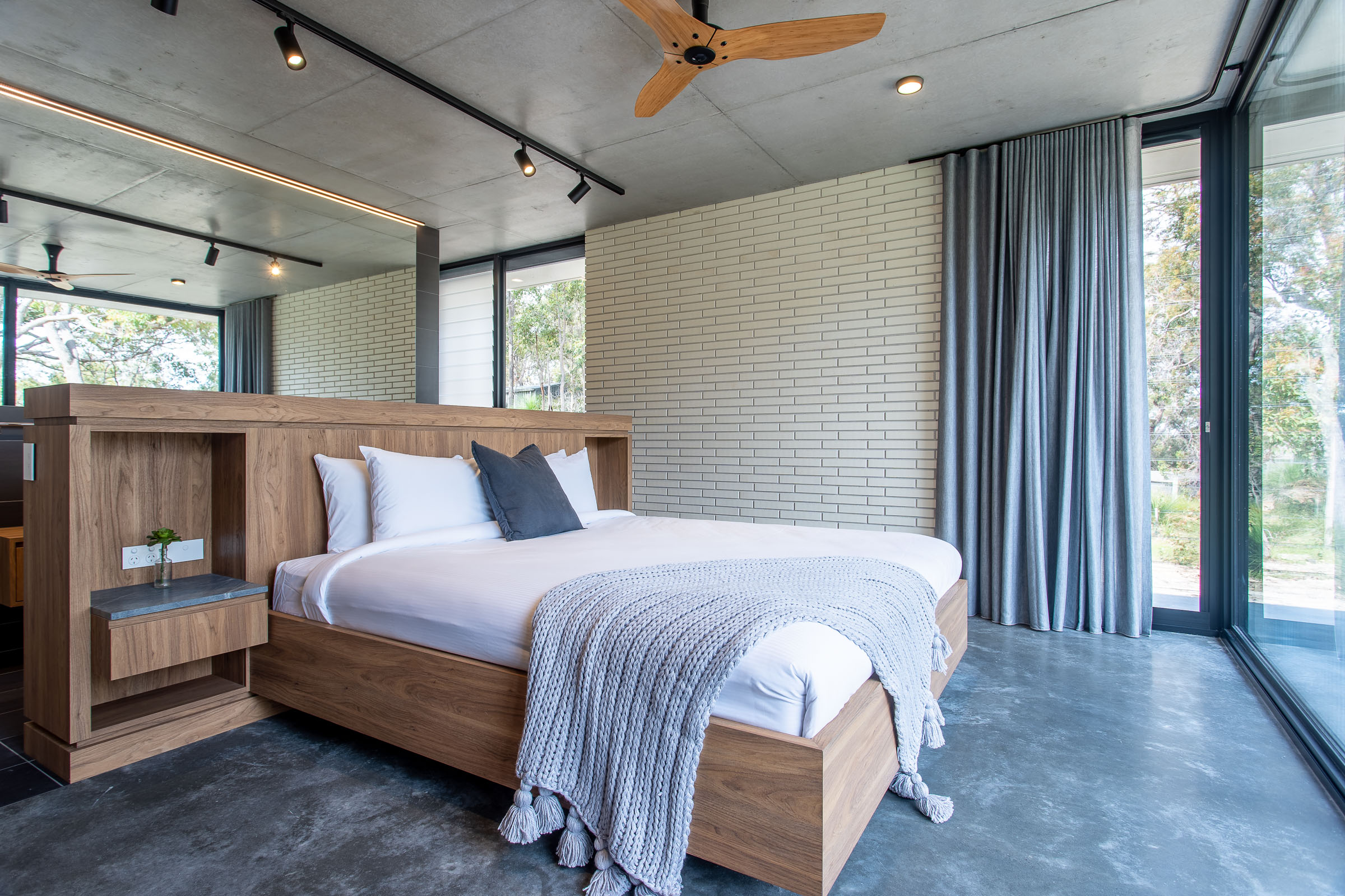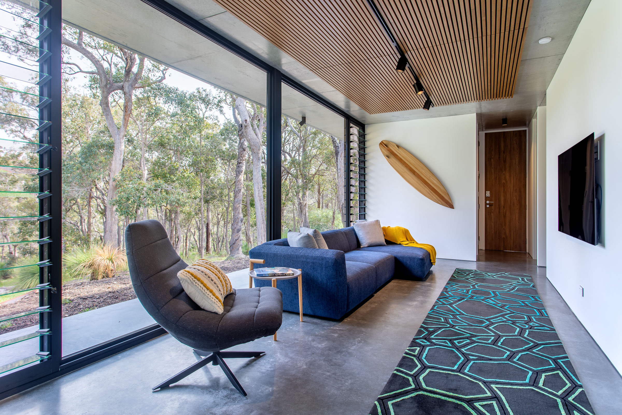 A seamless fusion of glass, concrete and wood coupled with it’s very unique shape creates a stunning holiday home. Floor to ceiling double glazed glass windows and doors separate the polished concrete floors and concrete ceiling with it’s acoustic timber panelling.