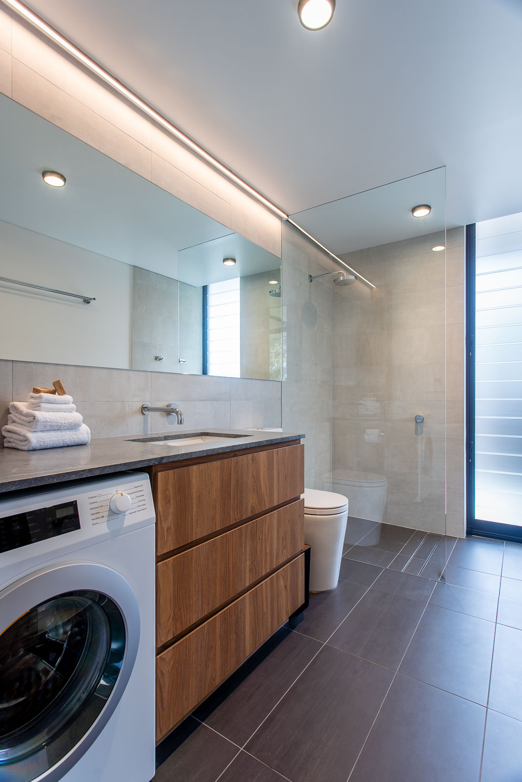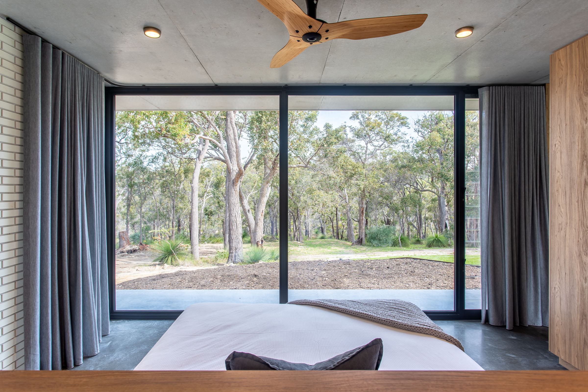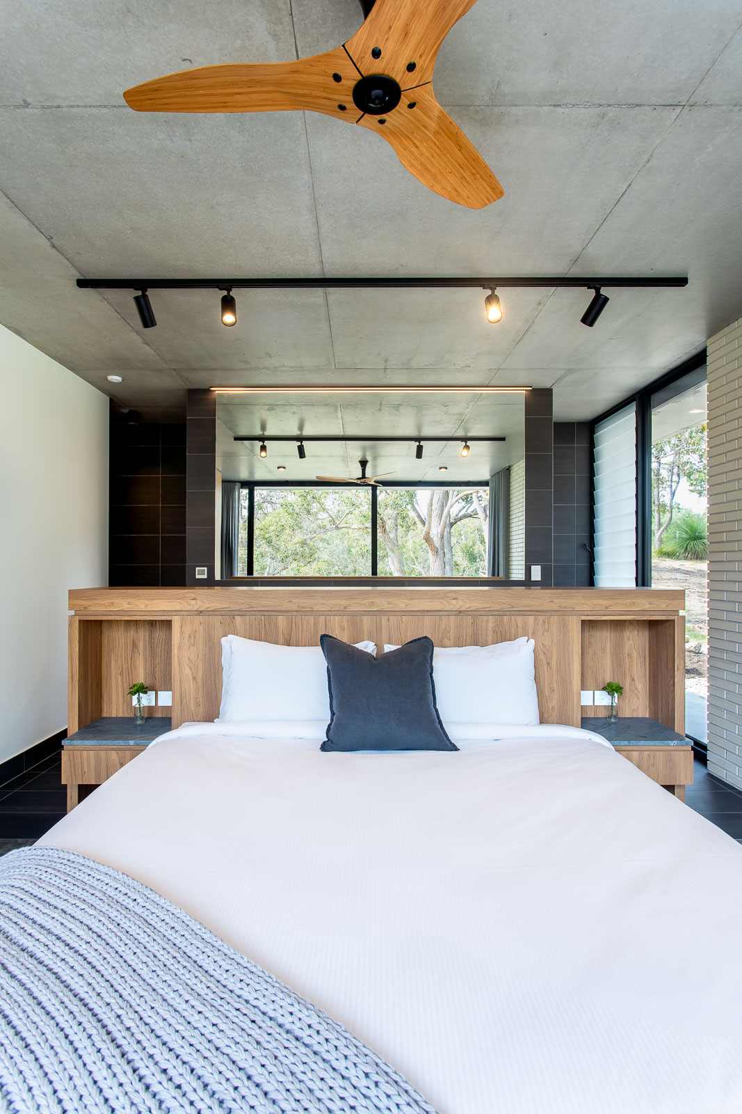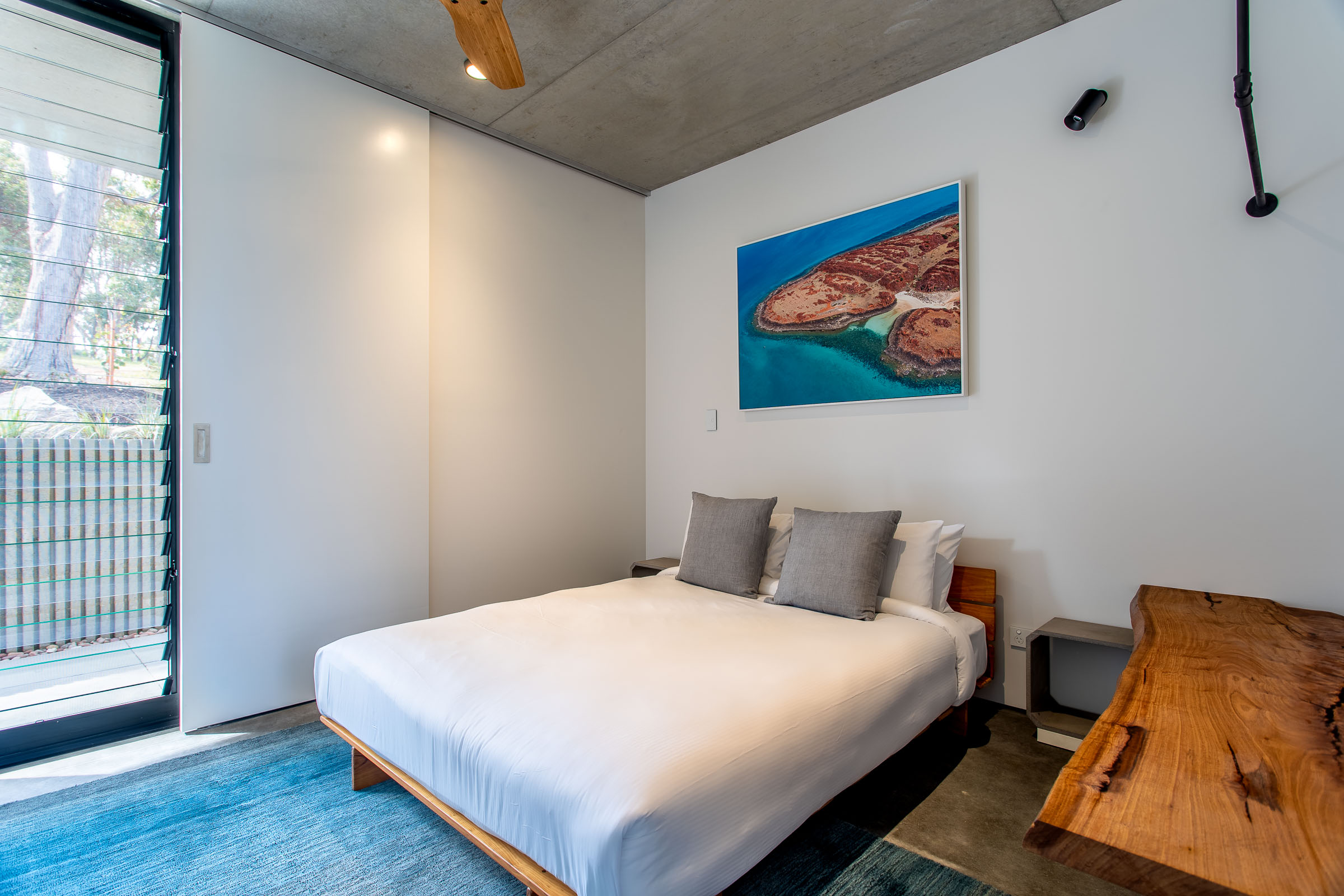 A seamless fusion of glass, concrete and wood coupled with it’s very unique shape creates a stunning holiday home. Floor to ceiling double glazed glass windows and doors separate the polished concrete floors and concrete ceiling with it’s acoustic timber panelling.
