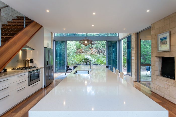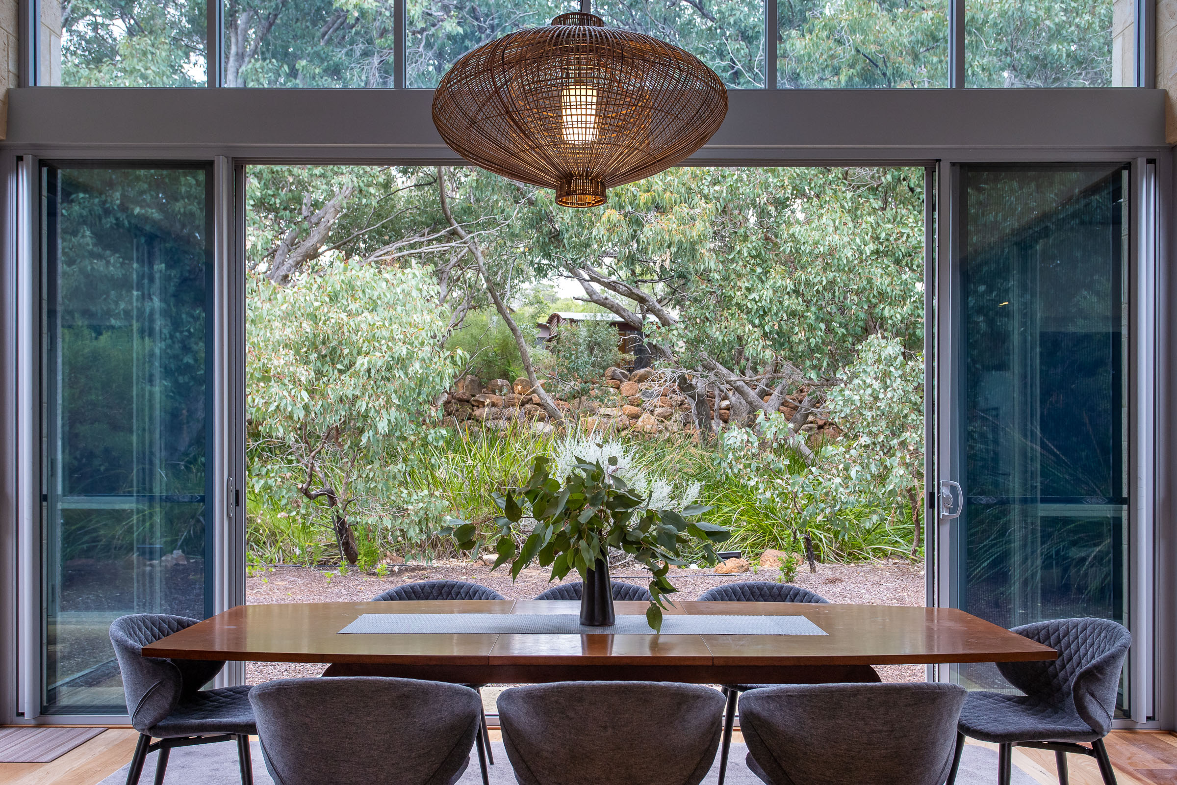 The spacious four-bedroom, three-bathroom home cleverly wraps around a central courtyard with a fabulous stone fireplace creating a sheltered alfresco space. The back garden’s natural landscaping of paperbarks and native grasses make a stunning backdrop.