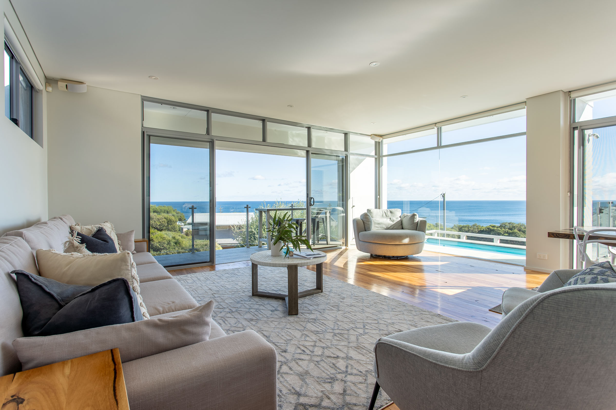 The open-plan kitchen, dining and living room on the mid level has high-impact ocean views and overlooks the stunning pool. The pool deck and alfresco BBQ area lead to the terraced lawns for a spot of cricket or croquet.