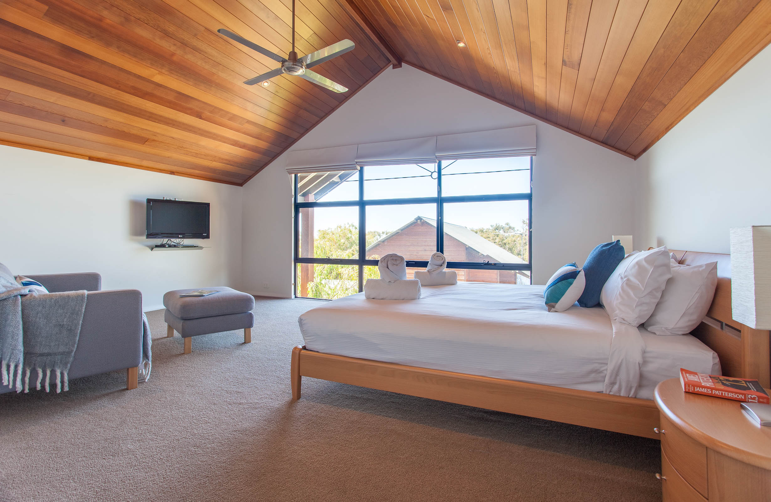 Pick from four generously sized bedrooms: upstairs is reserved for the holiday VIPs, and features a master suite with a walk-through wardrobe and ensuite, plus a private lounge; downstairs is best for families and features one master bedroom with ensuite and two twin single bedrooms with a shared bathroom.