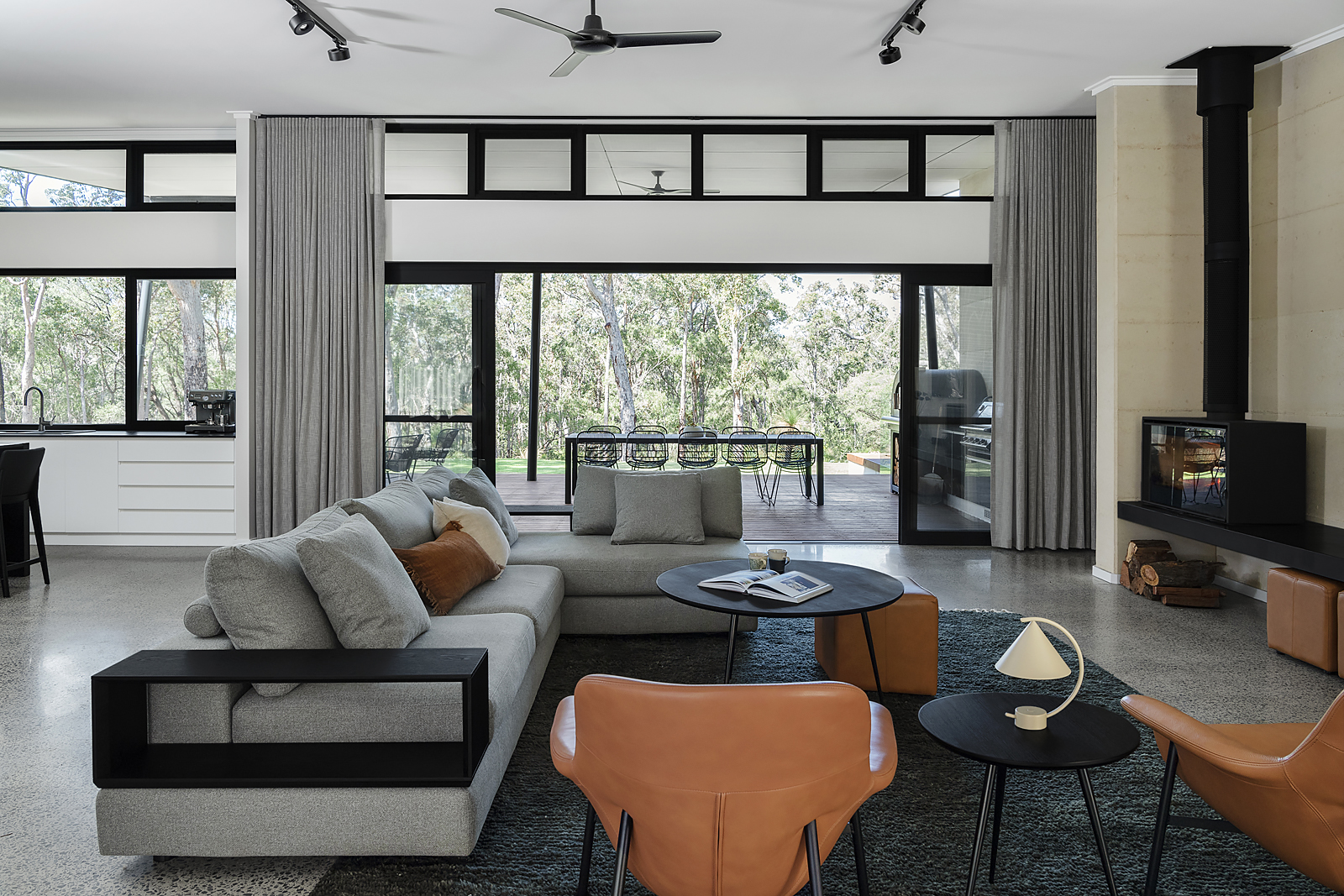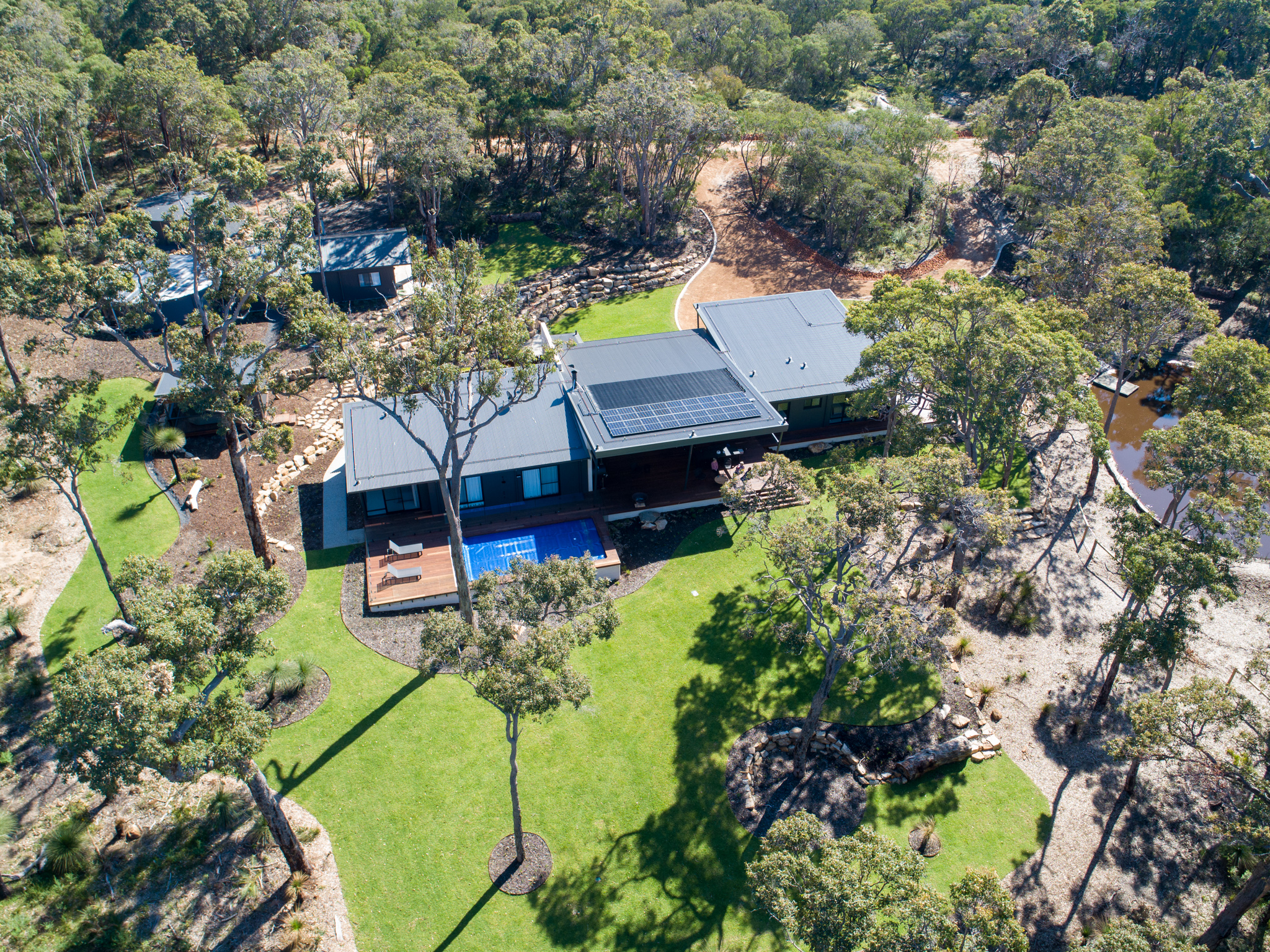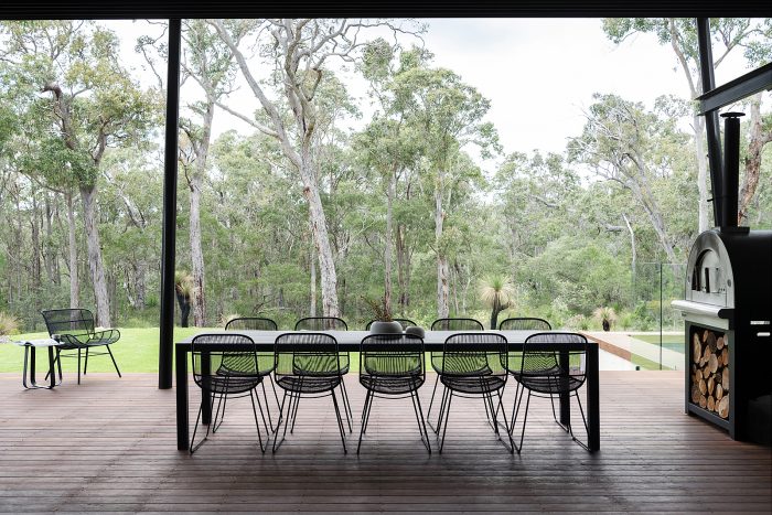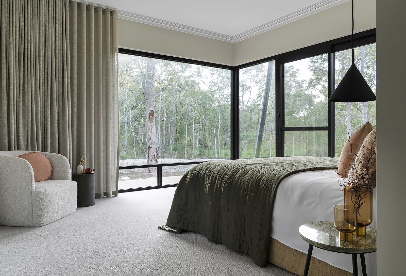 Bright, sun-dappled spaces are complemented by a sleek material palette, plush soft furnishings and pops of colour – think pastel pinks, turquoise greens and earthy ochres. Enveloped by towering karri and marri trees, native plants, and a large dam with a trickling limestone water feature, the home feels miles away from anything (and anyone) else; a tranquil escape for those looking for a well-deserved break.