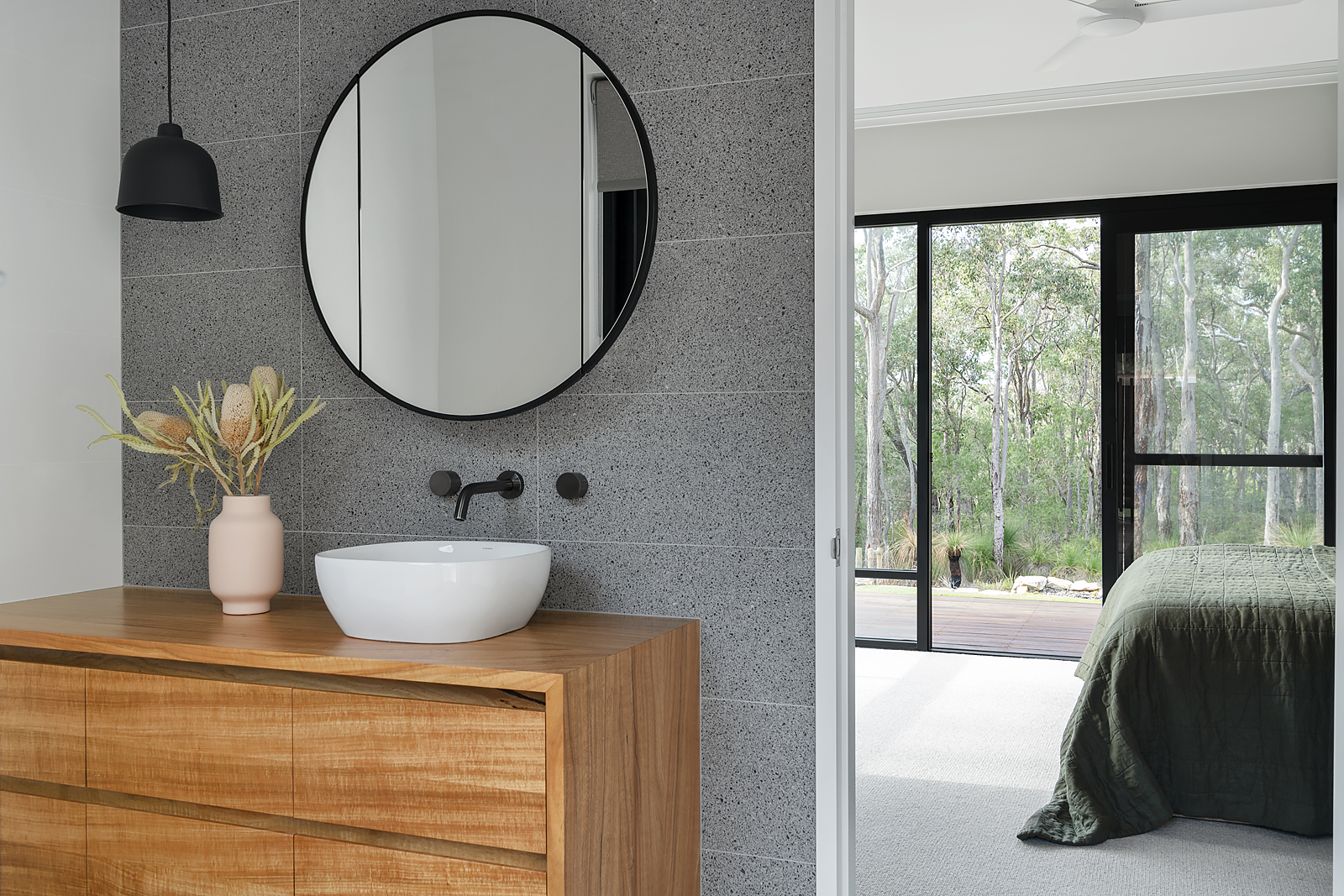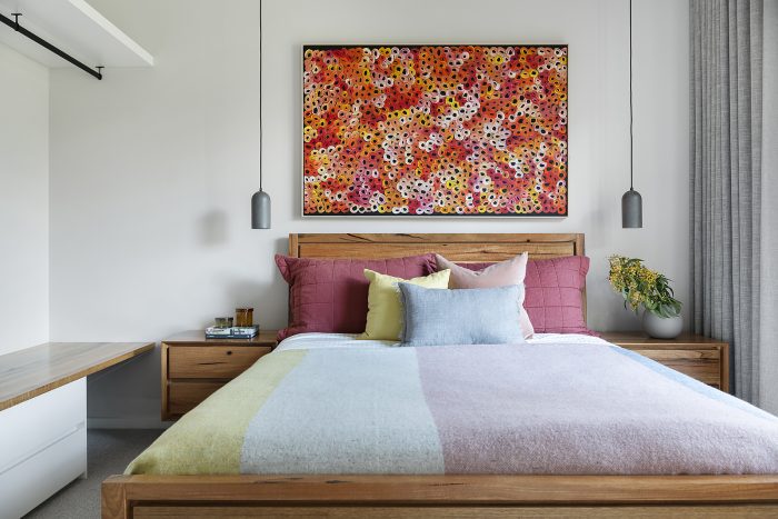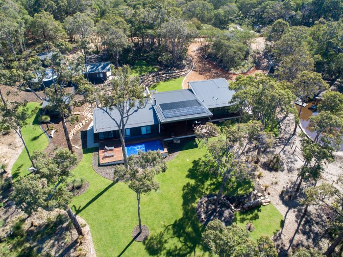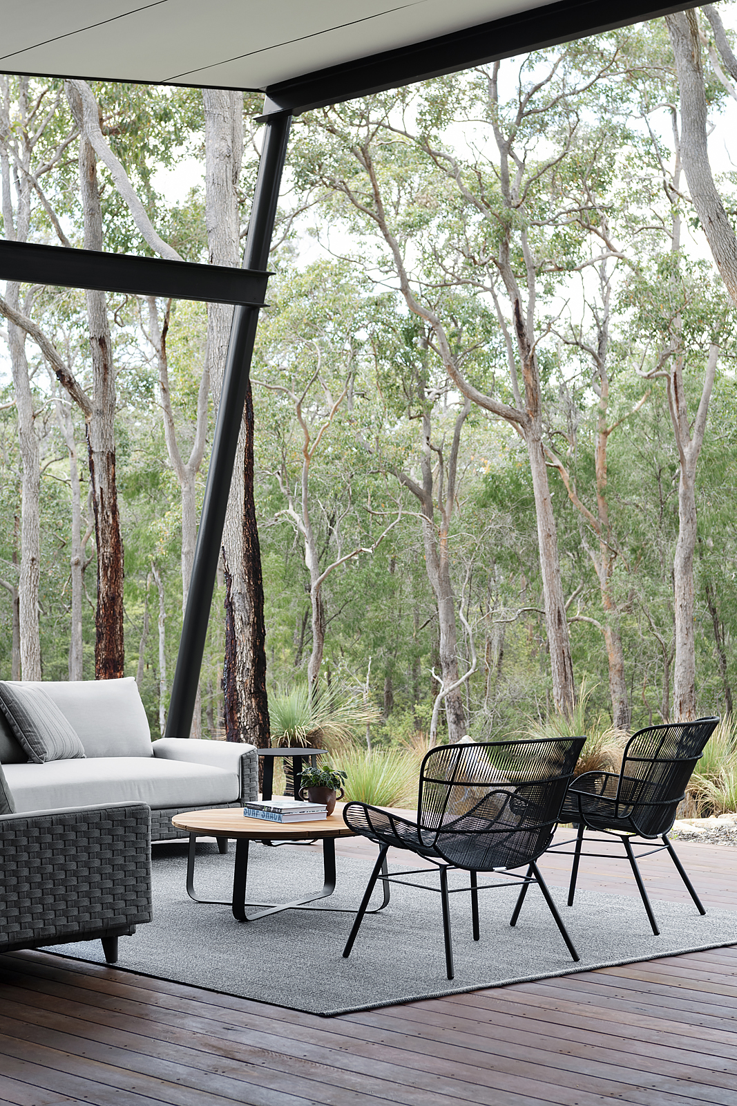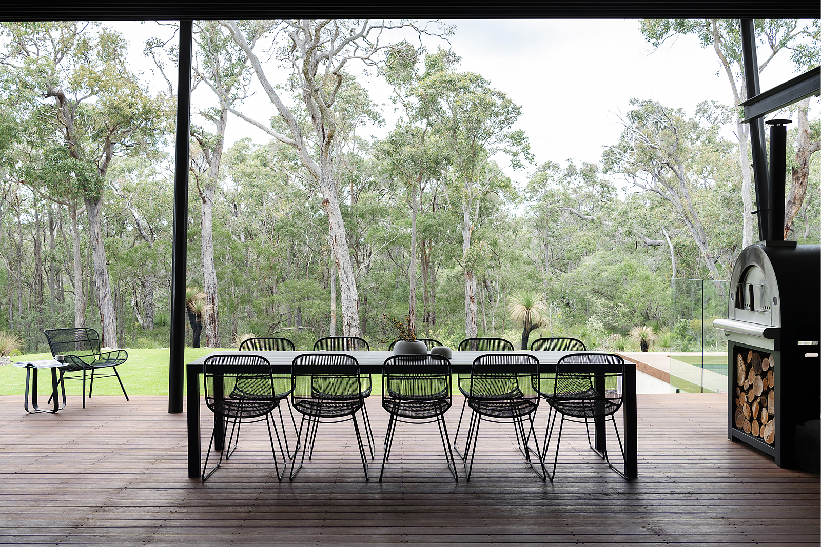 Bright, sun-dappled spaces are complemented by a sleek material palette, plush soft furnishings and pops of colour – think pastel pinks, turquoise greens and earthy ochres. Enveloped by towering karri and marri trees, native plants, and a large dam with a trickling limestone water feature, the home feels miles away from anything (and anyone) else; a tranquil escape for those looking for a well-deserved break.