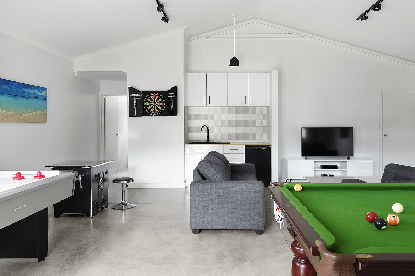 Studio - Pool table, air hockey, space invaders, dart board, TV.