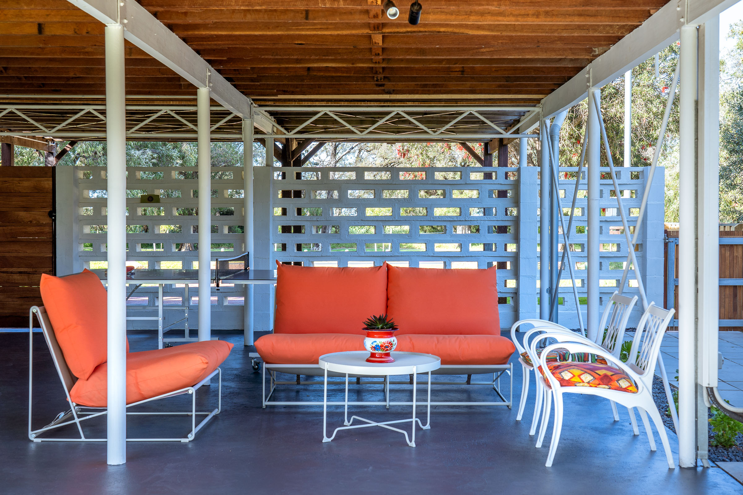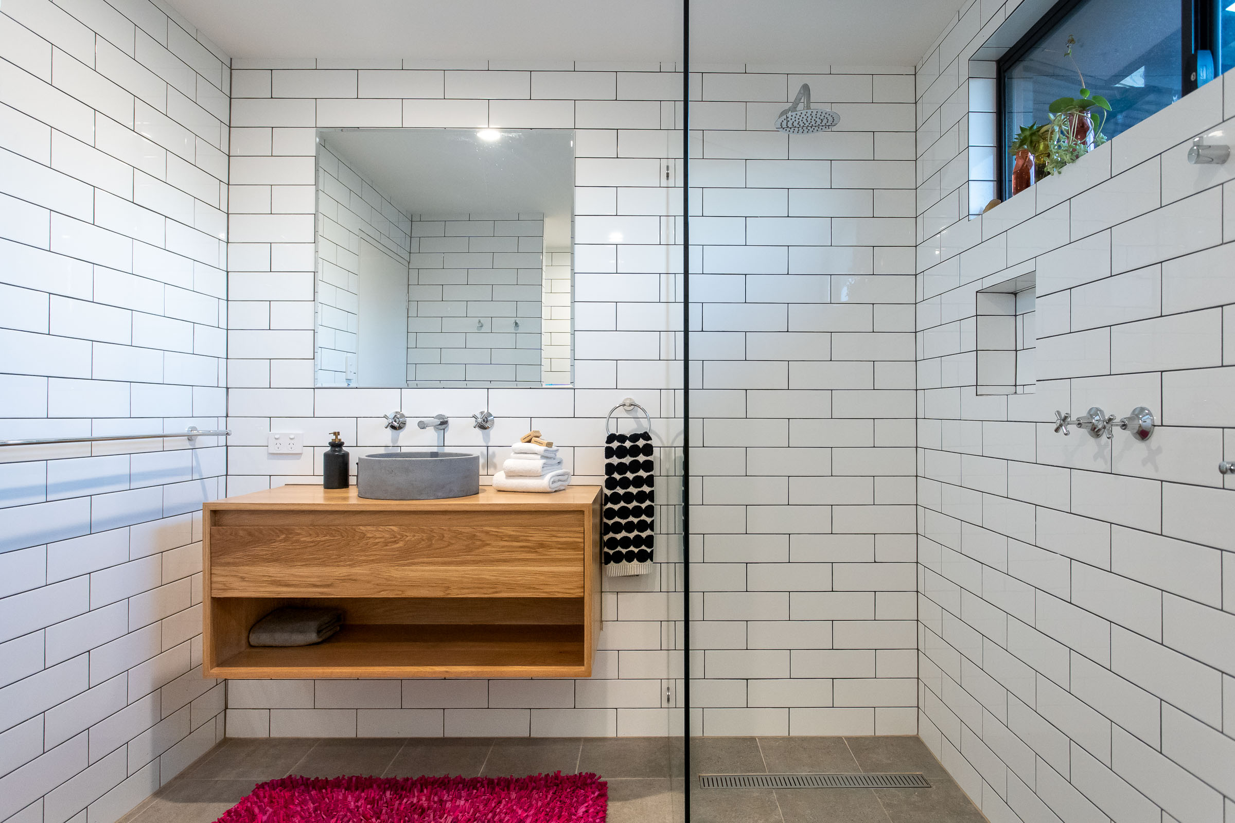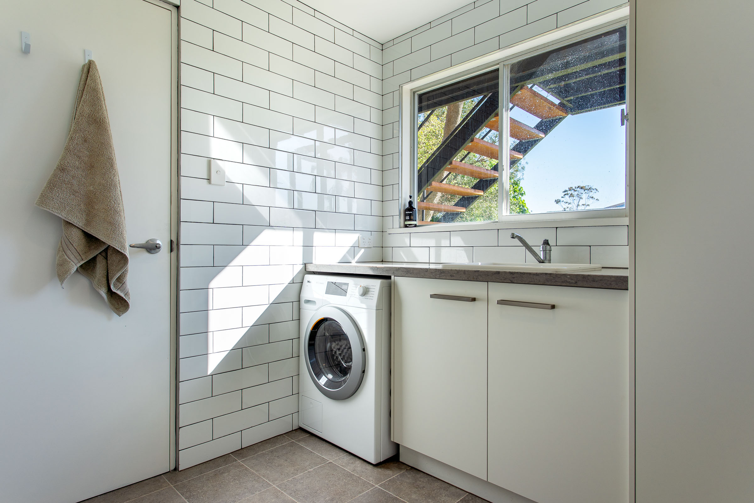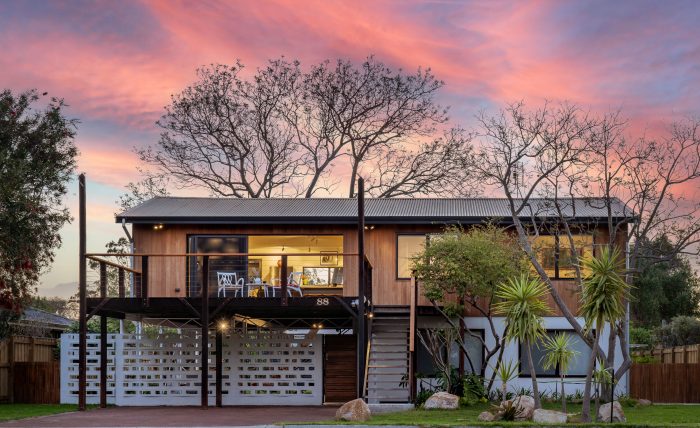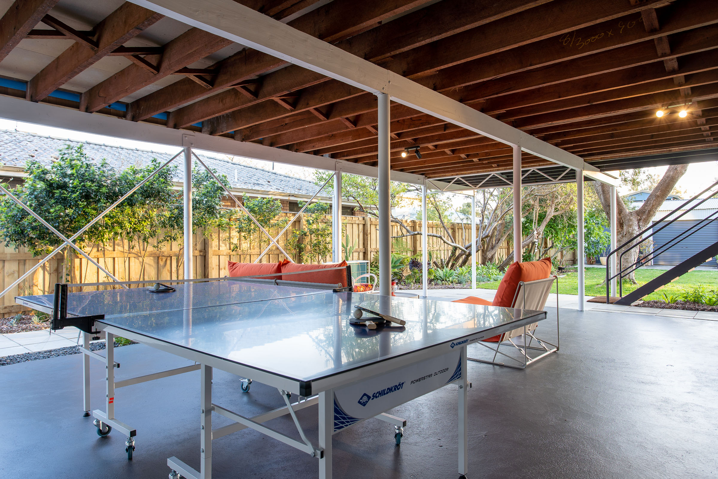 Upstairs features the open living, kitchen and dining area as well as the three bedrooms and one, shared bathroom. All on one level is ideal for a laidback holiday home, allowing you to move freely from the living area directly onto the deck, great for a balmy night’s dinner outdoors. Downstairs the undercroft alfresco area is perfect for those who want to pull out a board game, lounge on the sofas, or engage in a playful table tennis match. The laundry and additional toilet are also located downstairs.