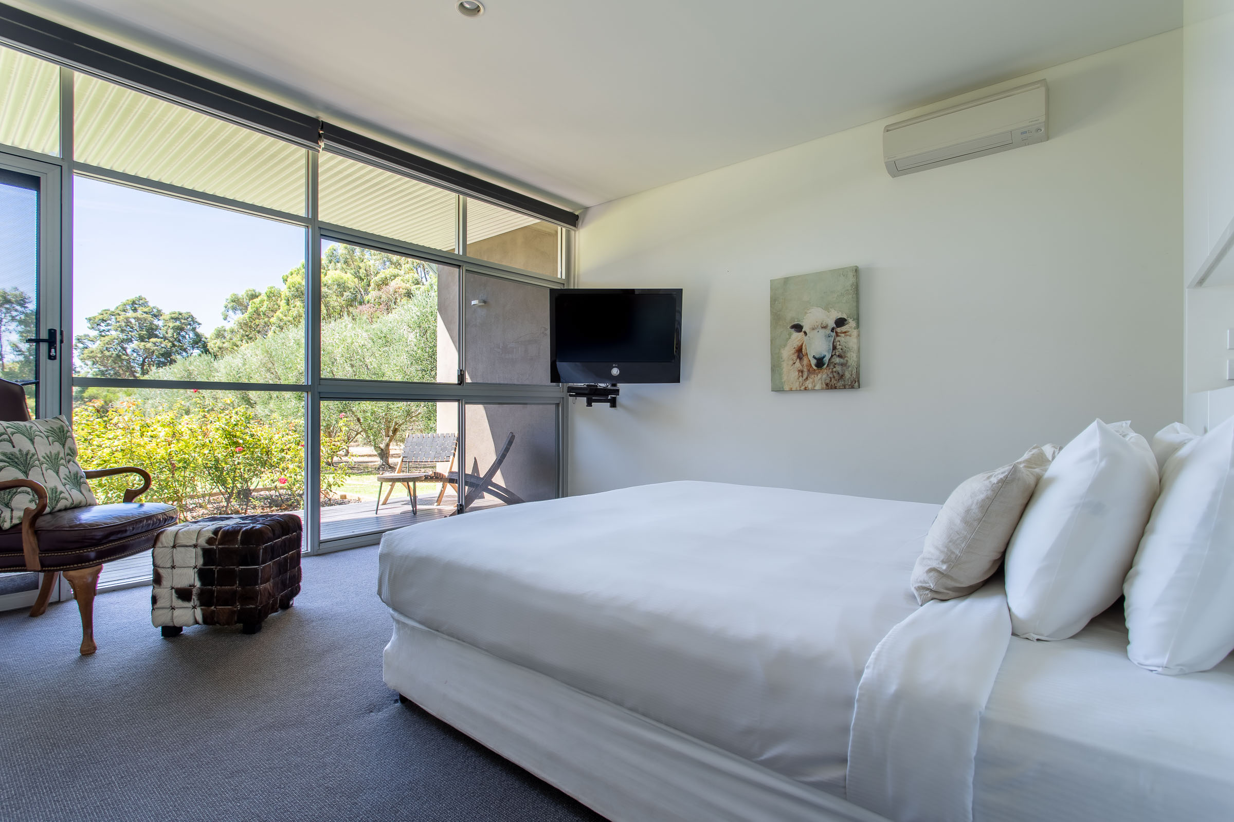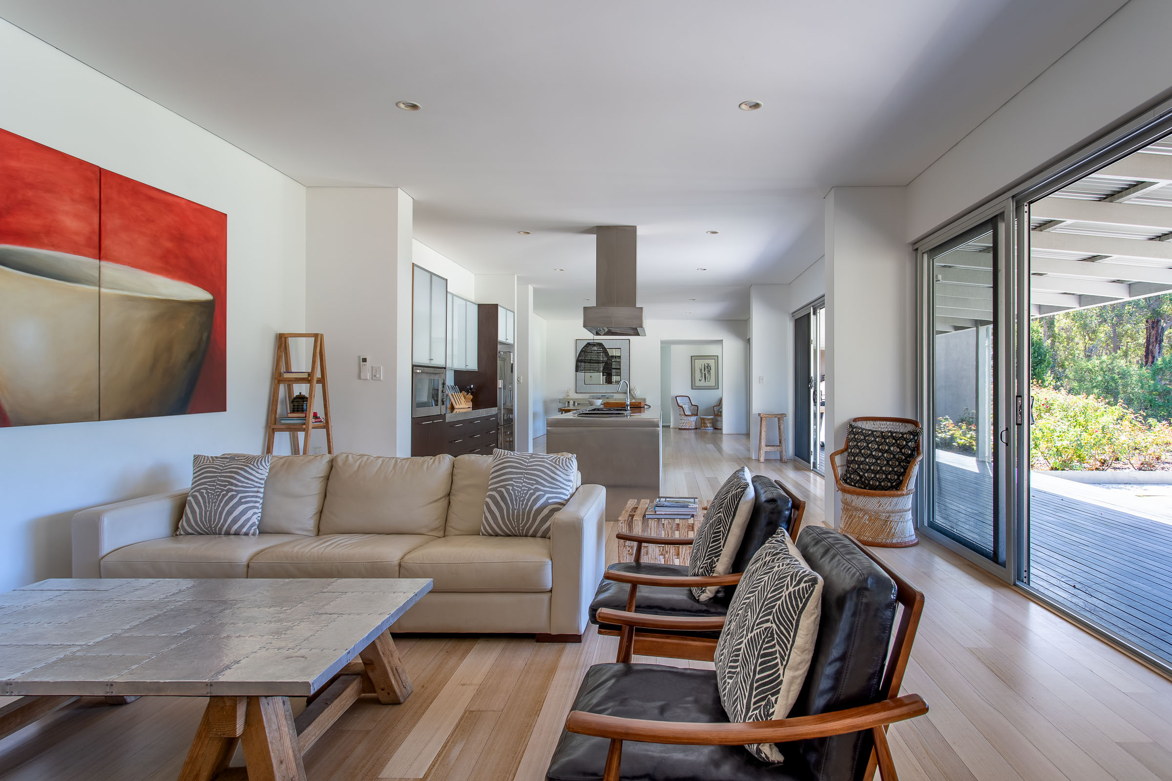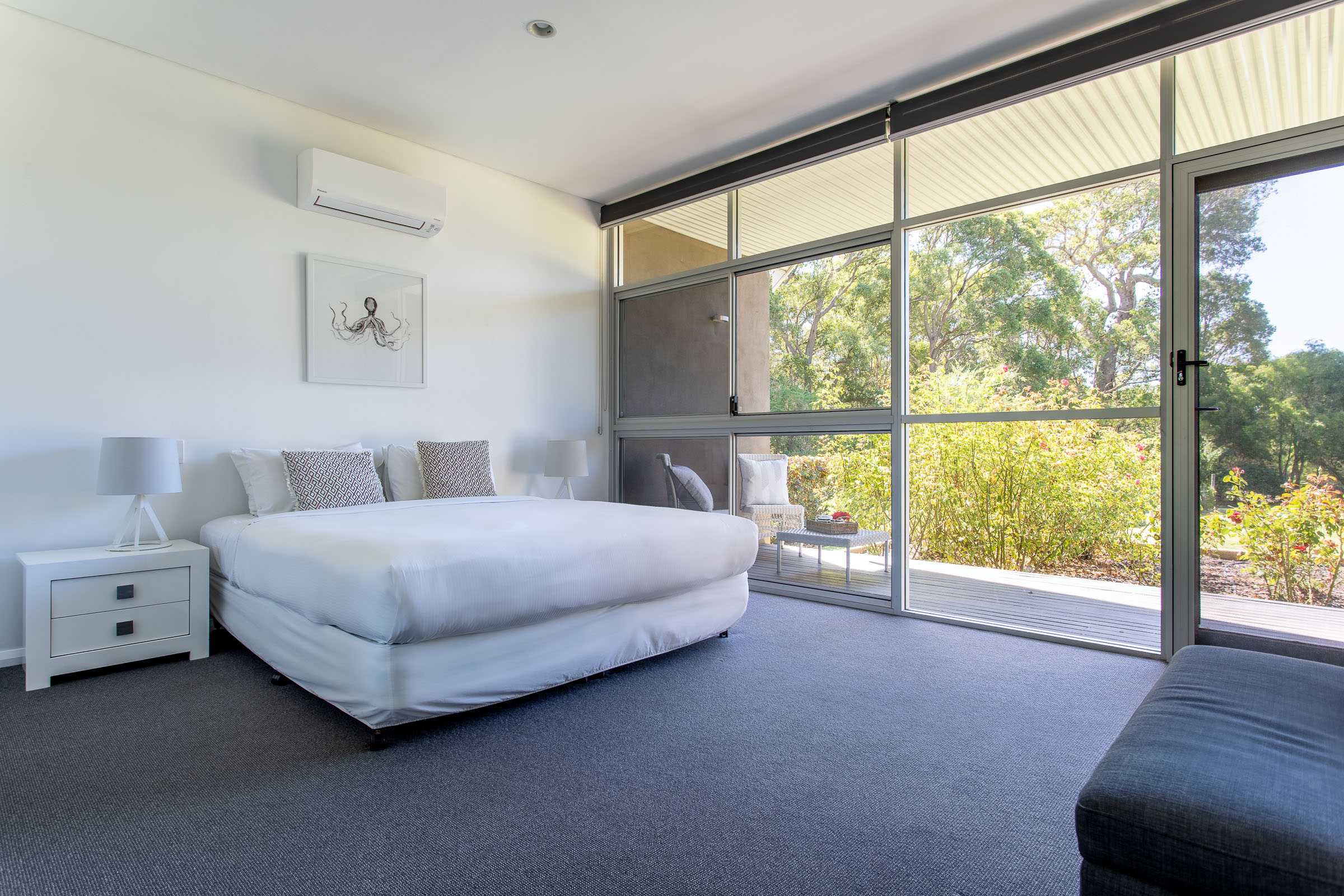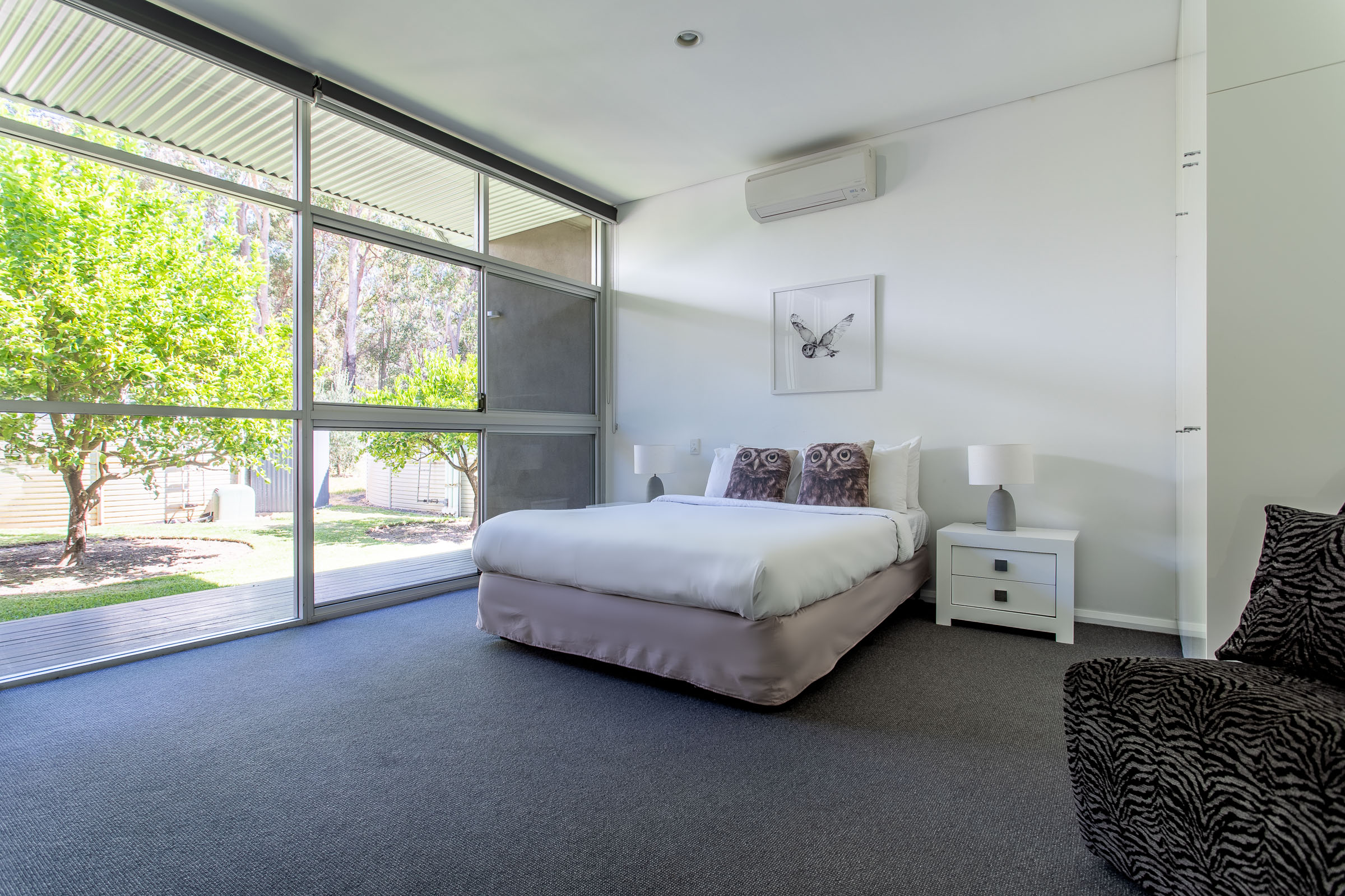 Wildwood Grove has two separate wings located at each end of the house, each with a private entrance. The bedrooms are spacious with built-in robes and reverse cycle air-conditioning, each opening onto a private deck with views of the natural surrounds. The bathrooms are sure to impress, with stainless steel vanities, heated towel rails, plus walk in shower and spa bath with views overlooking the gardens.