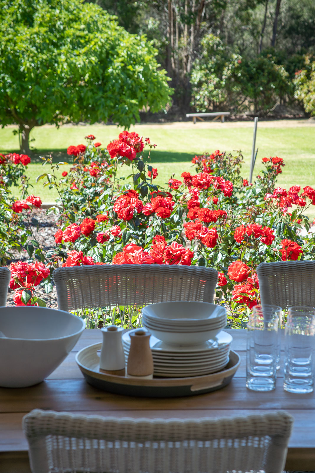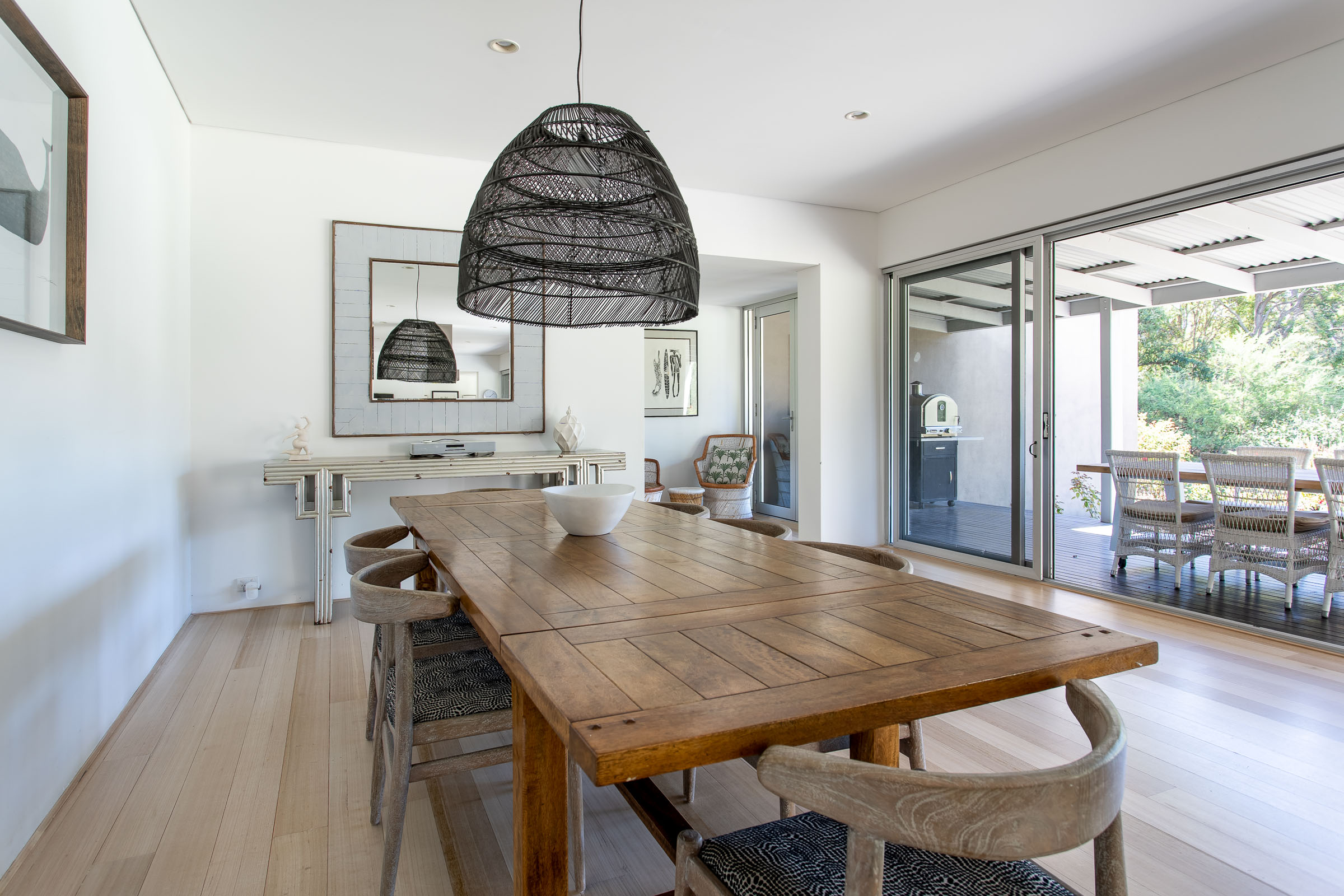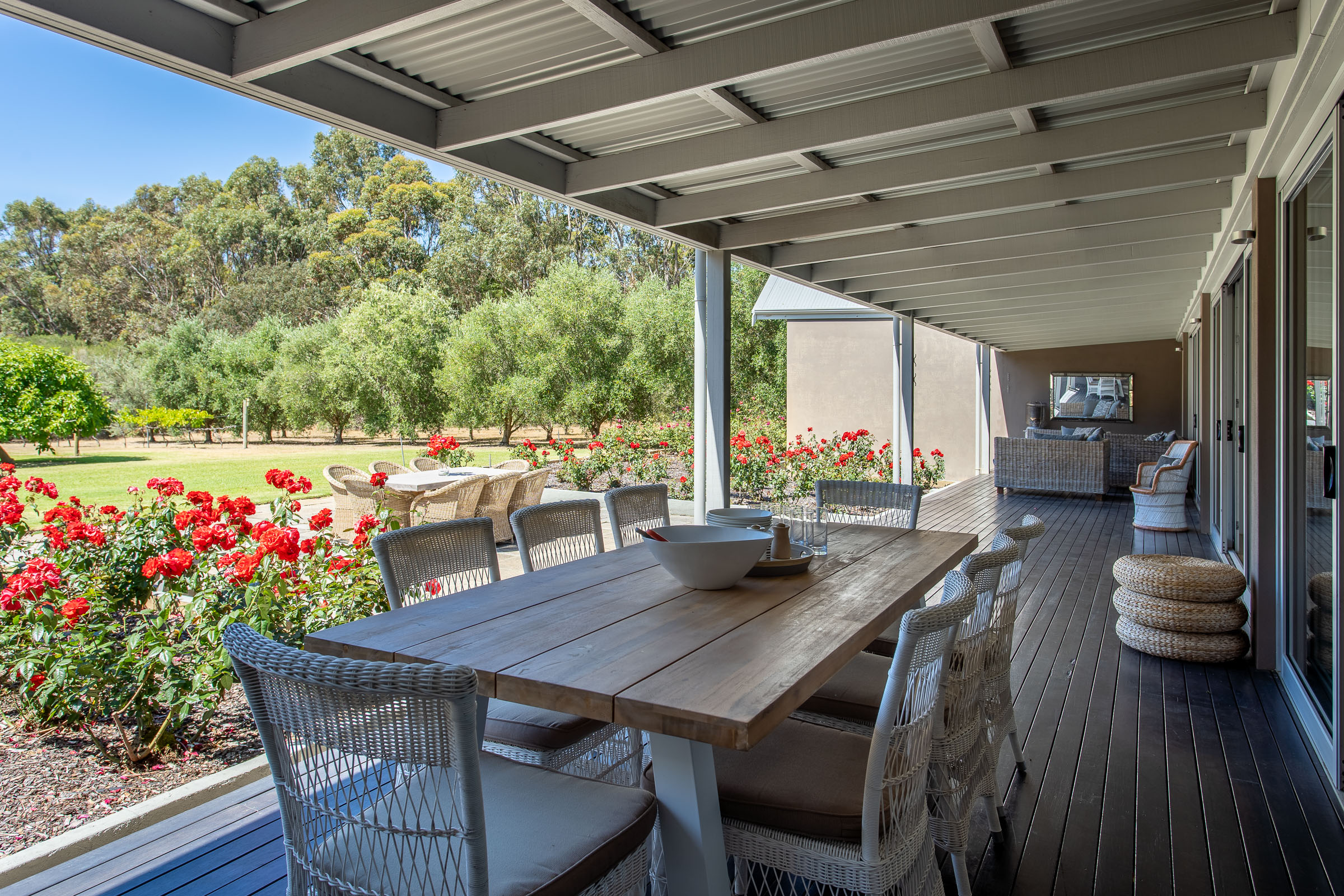 The living, kitchen and dining centres the house, with a big open-plan area leading to spacious timber decking. Enjoy alfresco dining with the BBQ and pizza oven or relax on the comfortable lounges at the other end of the deck. The additional outdoor dining table on the paved set between beautiful rose gardens, begs for long Italian-style lunches, whilst watching the children play in the pool.