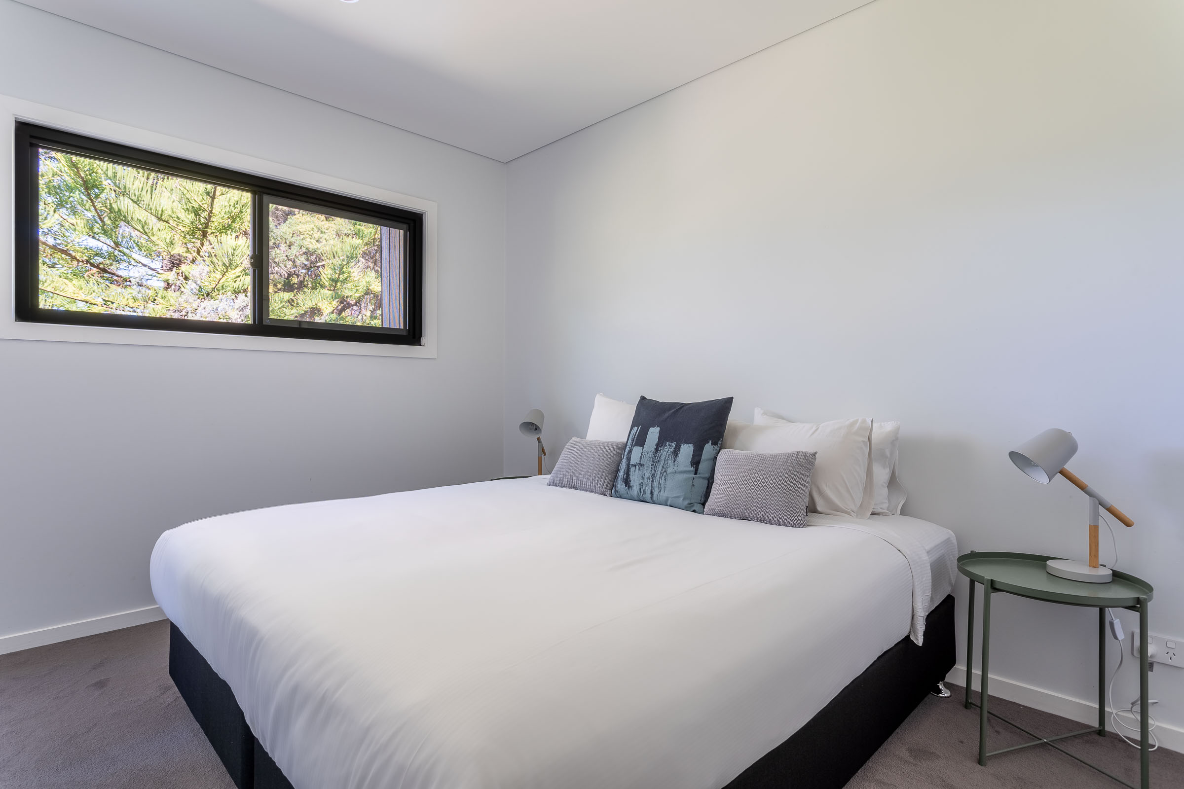 Woody Nook’s L-shaped layout lets guests embrace nature from almost every room. The main living area, enclosed by floor-to-ceiling glass windows and doors, opens up on either side to allow guests direct access to both the front lawn and the back garden – a central courtyard filled with native plants, trees and small ponds.