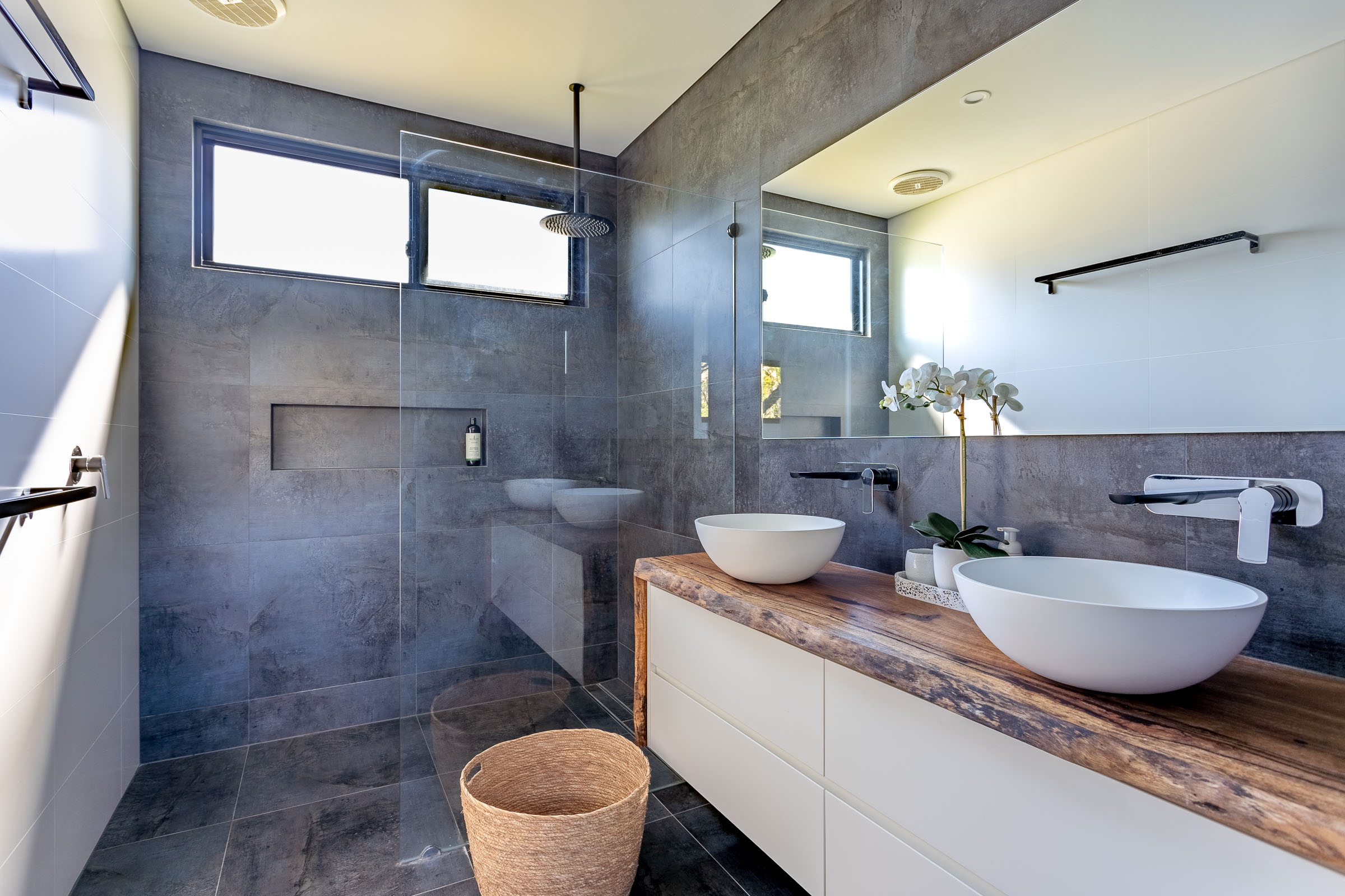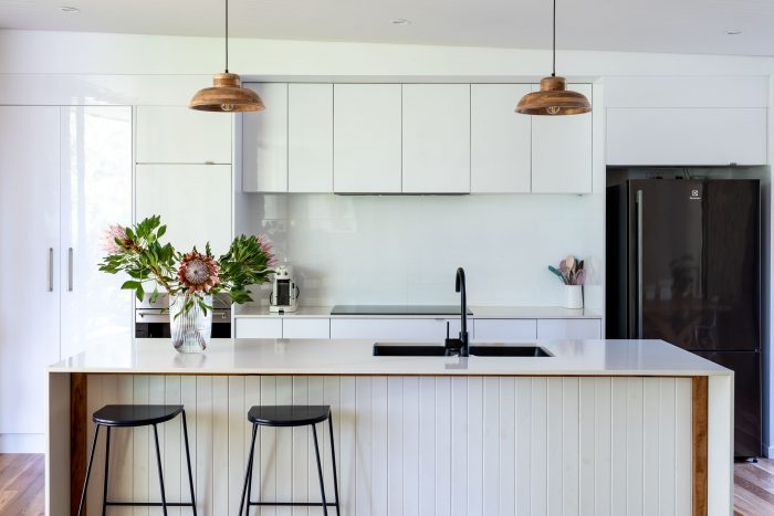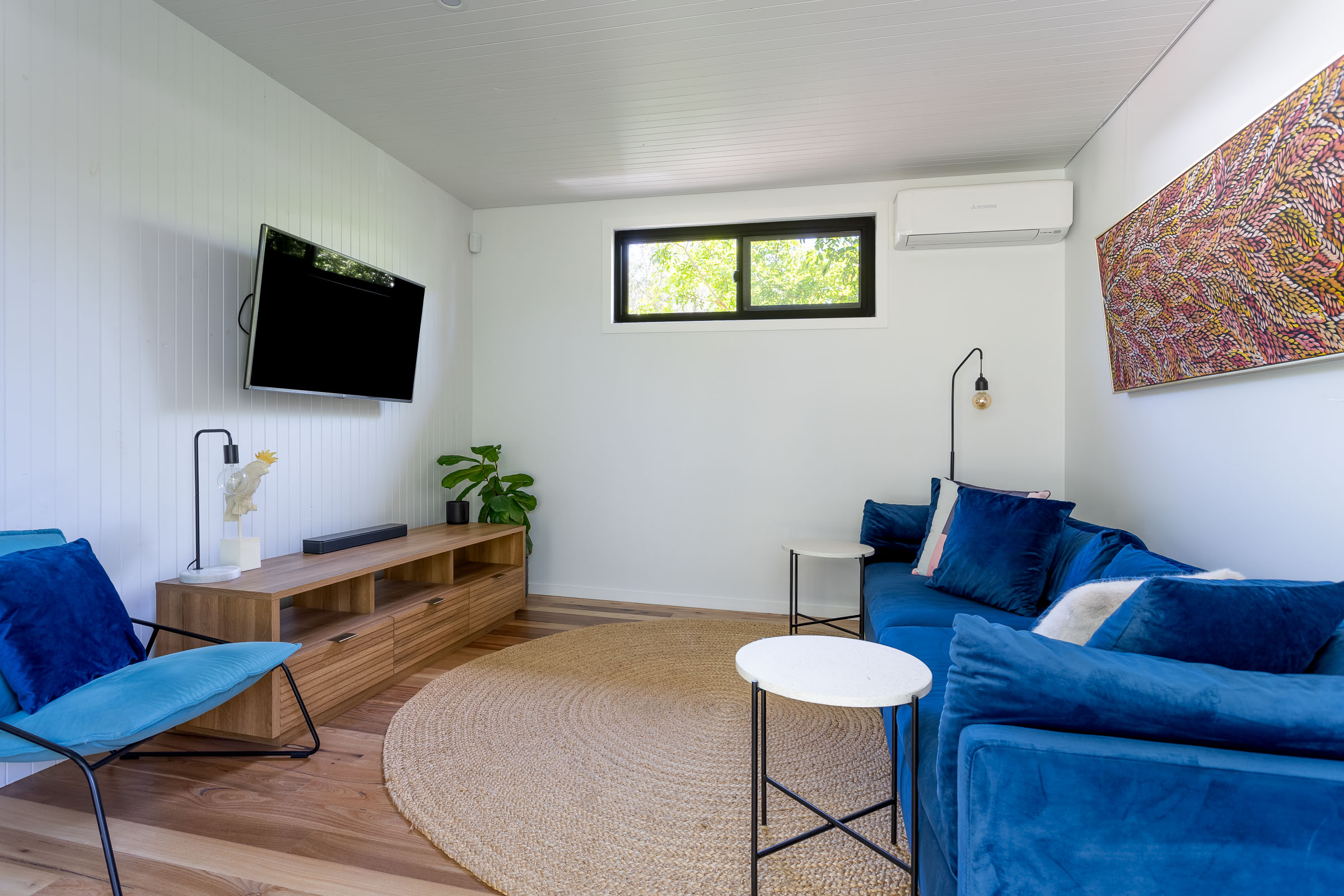 Guests can also access the courtyard, complete with trickling creek and a pleasant, tree-canopied sitting area, via the bedroom and TV room wing. Front and back alfrescos show off the home’s timber panelled exterior, which is complemented by an interior of polished wooden floors, rugged stone and crisp white walls.